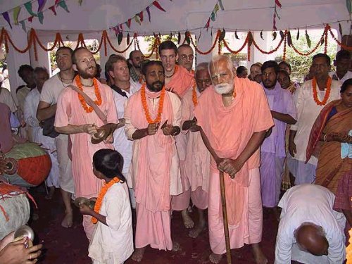 Østlige og vestlige munker leder an i lovsang i hallen ved siden av tempelet